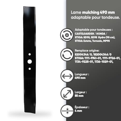 • LAME DE REMPLACEMENT POUR TONDEUSE MULCHING : Cette lame de tondeuse d’une longueur de 490 mm est idéale pour remplacer la lame d’origine et optimiser les performances de votre tondeuse mulching Castelgarden, Stiga ou Honda.