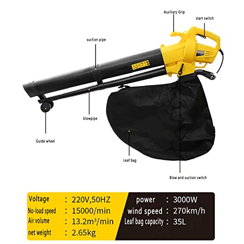 KIUYTQQ Souffleur, aspirateur et broyeur de Feuilles électrique 3000 W, électrique 3 en 1, Vitesse Variable, avec Grand Sac de Collecte d’une capacité de 35 L, 30 m